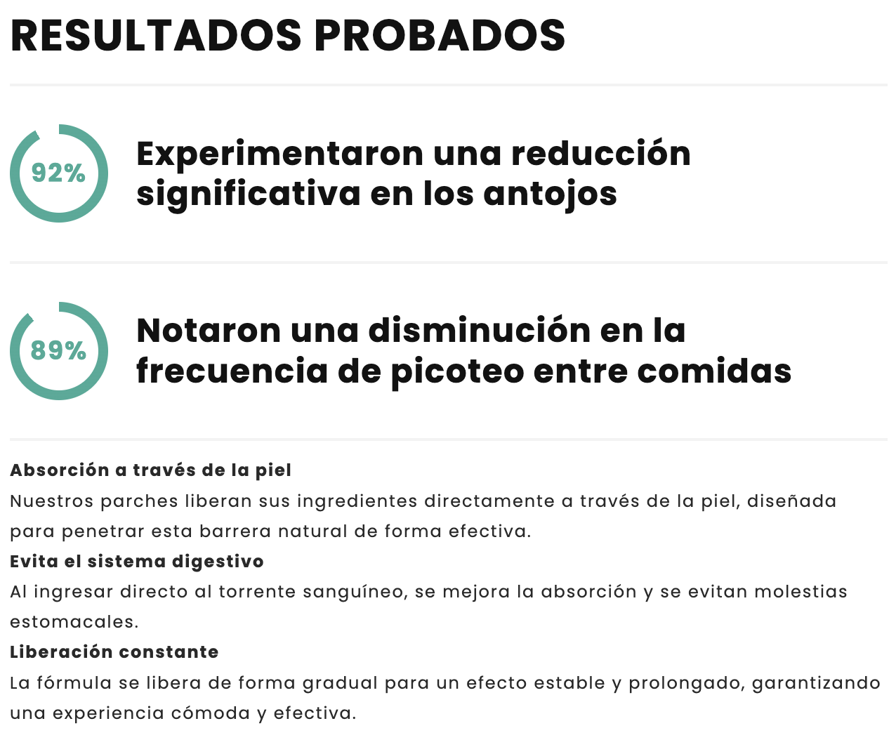 Los parches liberan gradualmente ingredientes naturales que apoyan el control del apetito y promueven el bienestar metabólico.